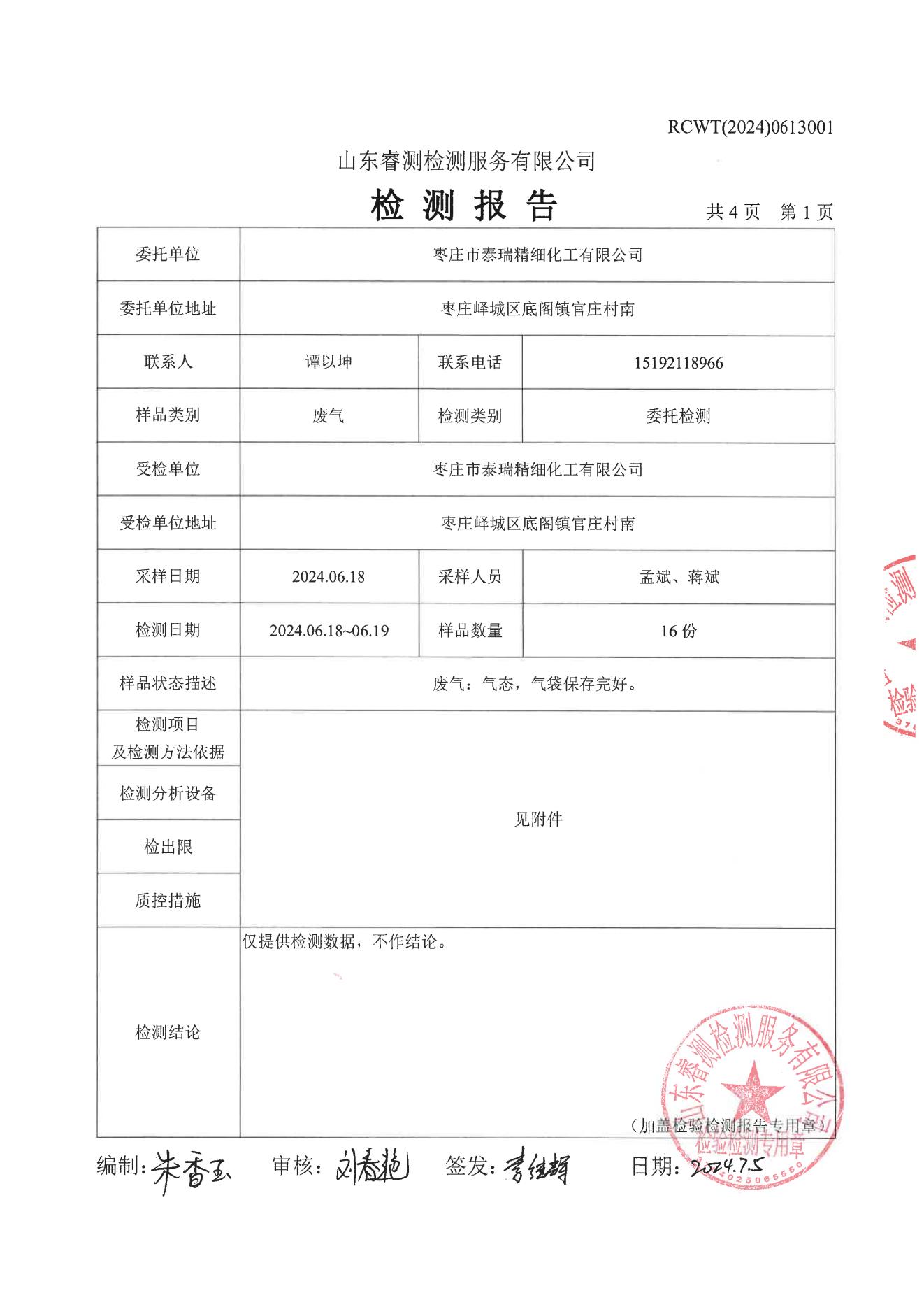 2024.6環(huán)境檢測報(bào)告泰瑞化工報(bào)告
